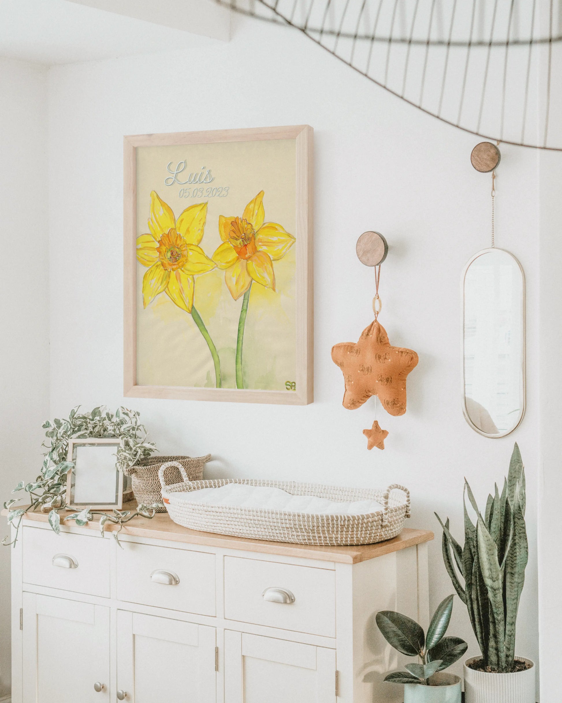 Die handgemalte Narzisse ist das perfekte, personalisierbare Geschenk für alle Märzkinder. Die frische, strahlende Frühlingsblume steht für Neuanfang, Selbstvertrauen und Eitelkeit, aber auch für grenzenlose Liebe sowie Großzügigkeit. Ein echter Blickfang für jedes (Kinder-)Zimmer!